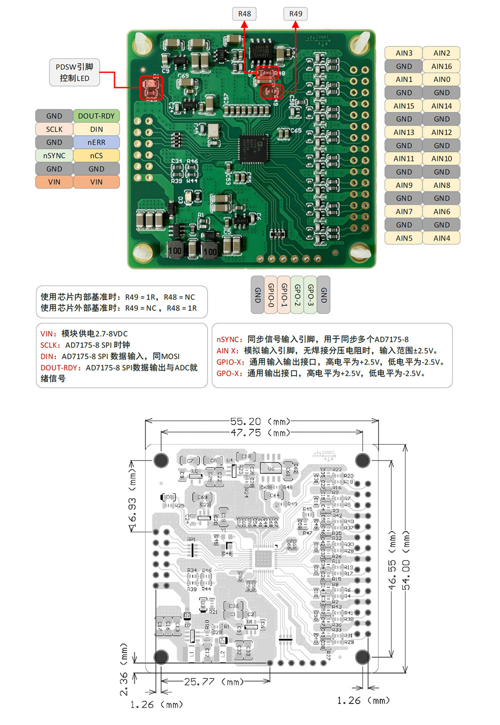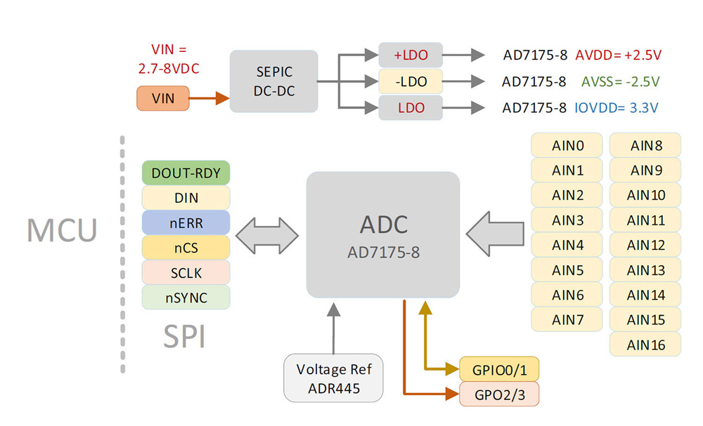 • AD7175-8 ADC module 24Bit 250Ksps 8-channel differential/16 channel single ended ± 2.5V