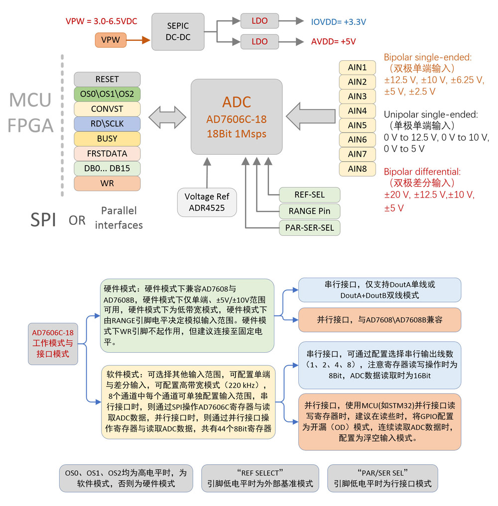 Answer: AD7606C-18 is an upgraded version of AD7608, which adds a software mode for configuring ADC through registers to achieve extended functions such as multi input range, high analog bandwidth, and support for differential input. Please refer to the AD7606C-18 datasheet for details; The added functionality makes the operation of ADC more complex.