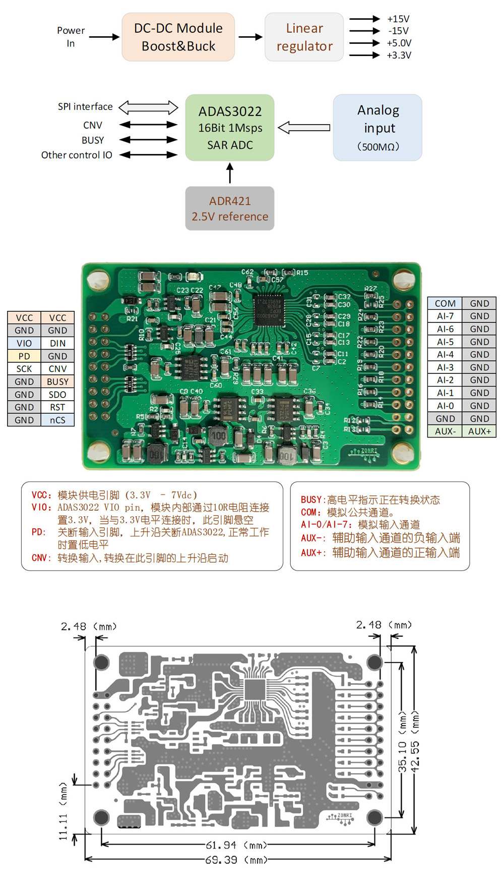 ADAS3022 ADC module 16 bit 1Msps SAR high impedance 8-channel single ended 4-differential input