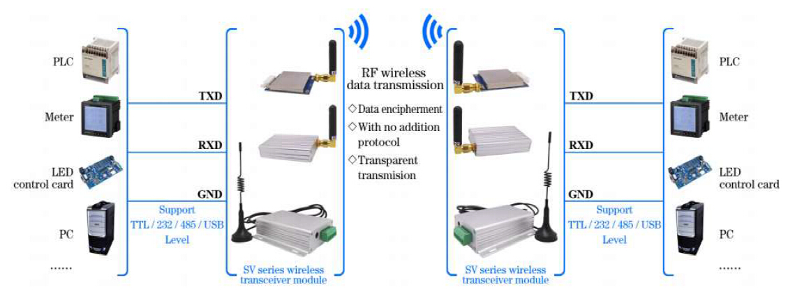 SV6202 is an ultra long distance & highly-integrated RF transceiver module, which adopts the high performance Si4432 from Silicon Labs and industrial micro-controller. TTL / 232 /485 can be chosen corresponding to SV6202-TTL / SV6202-232 / SV6202-485. SV6202 has good sensitivity and 1W output power to achieve long RF range and reliable RF communication. To avoid the interference, SV6202 provides 40 frequency channels and configurable Net ID. SV6202 is flexible but easy to use, it comes with many parameters, such as: frequency, data rate, output power, Net ID, Node ID. Users can configure the parameters through PC or customer’s own device.
