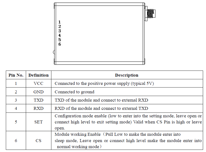 After Power on Reset, the module enters into sleep mode when CS pin is pulled low. In this mode, the current consumption is very small. In Sleep mode, the module can’t do any communication and cant’ be set even Set Pin is pulled low. All the parameters will be kept unchanged in Sleep mode. User can wake up the module by pulling high the CS Pin.